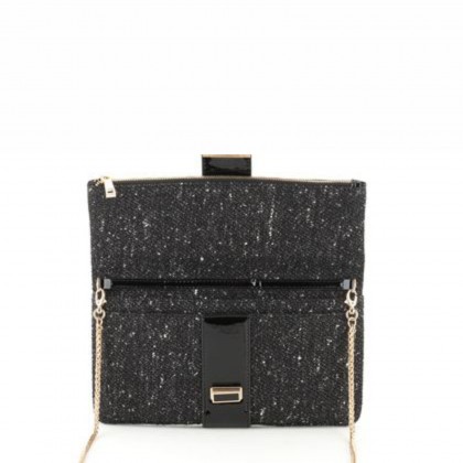 Стилна и елегантна дамска чанта от Clarks, комбинация от лачена кожа и изящен туид на известната марка Linton. Ефектна комбинация между черно и бяло в долната част и елегантен лак – в горната. Елегантната катарама и цип придават допълнителна изтънченост, но дългата дръжка, която можете да премахнете, ако не използвате, дава възможност за използване при по-разнороден вид събития. Вещите ви са защитени от допълнителен вътрешен цип. Дължина: 30cm Ширина: 4cm Височина: 17cm