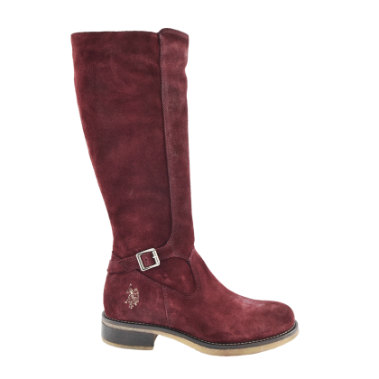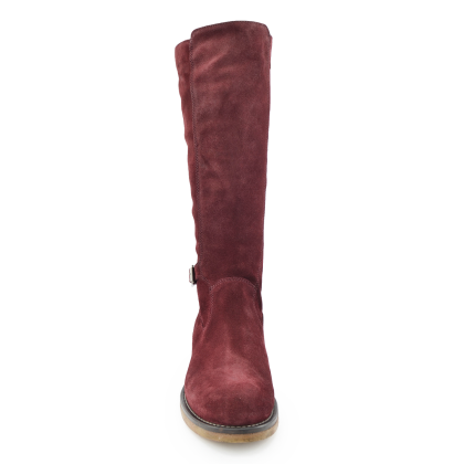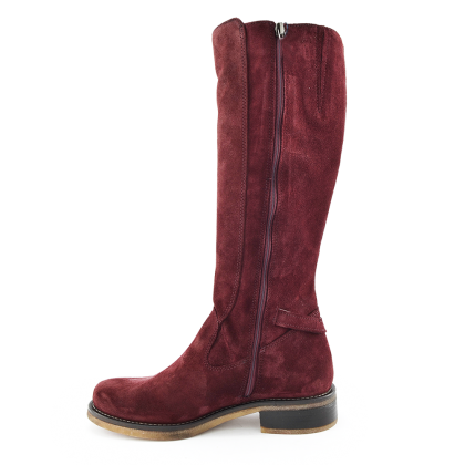 Дамски велурени ботуши, с изчистени линии – елегантни и стилни. Цветът е бордо, удобна подметка, нисък ток, подходящи за натовареното ежедневие на заетите дами. Катарамата от външната страна придава индивидуалност на модела и го прави изключително елегантен.
