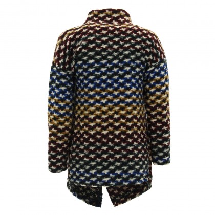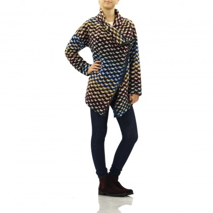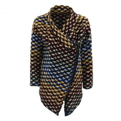 Дамско асиметрично сако PLEASE. Моделът е изключително атрактивен, но и практичен за ежедневието. Изработено е от висококачествена вълнена материя в съчетание от земни тонове и синьо. Комбинира се отлично с дънки, панталон, както и боти, ботуши или кецове.