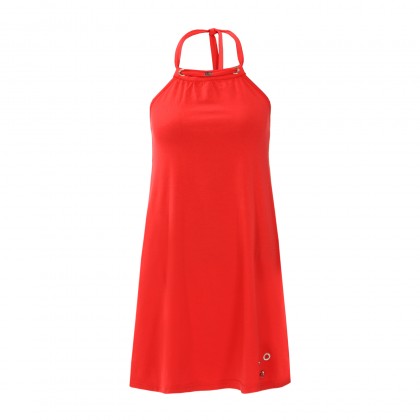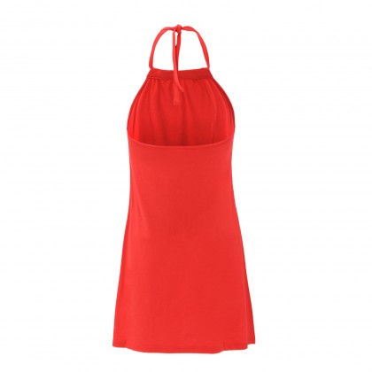 Моделът е с една презрамка през врата, гол гръб, свободна кройка и стилен червен цвят.Комбинира се идеално със сандали и спортно-елегантни аксесоари.
