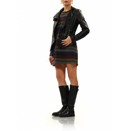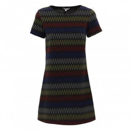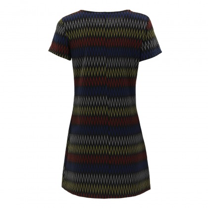 Рокля PLEASE е универсален избор за ежедневието. Комбинира се еднакво добре с официални обувки на висок ток, равни сандали и боти. Моделът е изработен от висококачествена и много приятна материя. Десенът представлява зигзагообразни елементи в различни цветове, разположени хоризонтално. Рокля PLEASE е с деколте тип „лодка“ и къс ръкав.