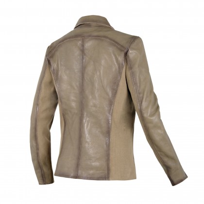 Кожено сако с яка,в светло кафяво, с памучна подплата. Вталената кройката, плюс двата предни джоба го прави подходящо за всякакви поводи . Комбинация от естествена кожа и текстил по цялата дължина на ръкаваРазмерът варира от S до XL.