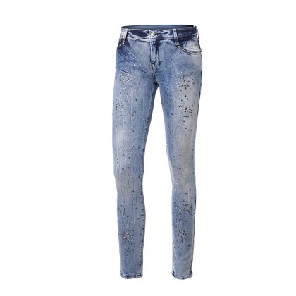 Елегантен модел дънки със средна дължина в светло синьо. Цялата предна част е украсена с топлинно запечатани кристали и черни диамантени елементи за бляскава и запомняща се визия.