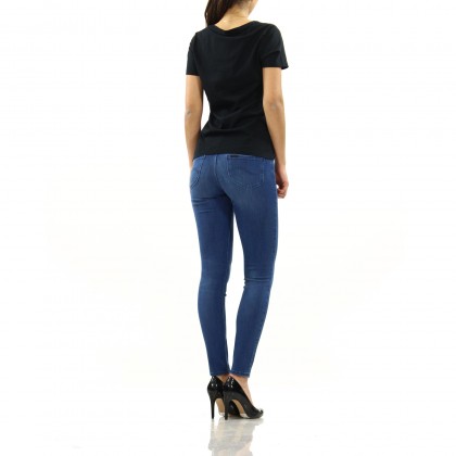 Дамски дънки Scarlett са skinny-fit дънки с ниска талия и 5 джоба, като задните са по-малки от стандартните. Моделът е с дължина до глезените, като осигурява удобство и класическа визия. Дънките са произведени от еластичен и лек деним за максимален комфорт. Върху бедрата е приложен ефект на износена и избледняла тъкан. Всичко това се допълва от черните гланцирани копчета, както и кожения етикет в черно, намиращ се в задната част на дънките.