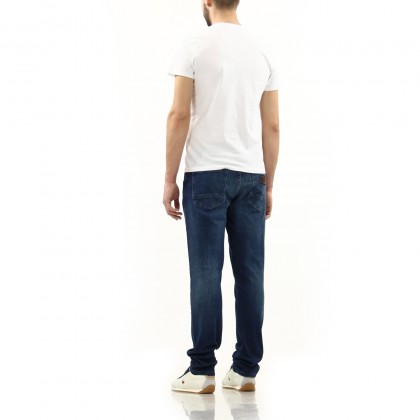 Мъжки дънки Greensboro са с regular-fit кройка за една класическа визия. Моделът е произведен от качествена памучна тъкан в наситен син цвят. Разполагат с 5 джоба и W-образен шев върху задните. Добавени са ефекти на избелели ръбове на подгъвите и джобовете.