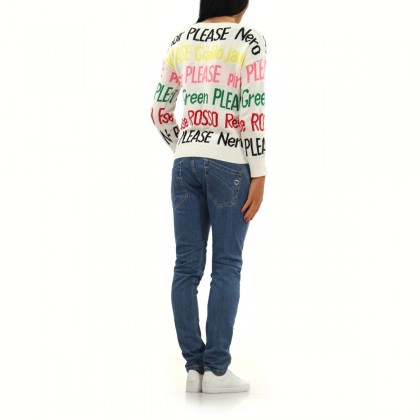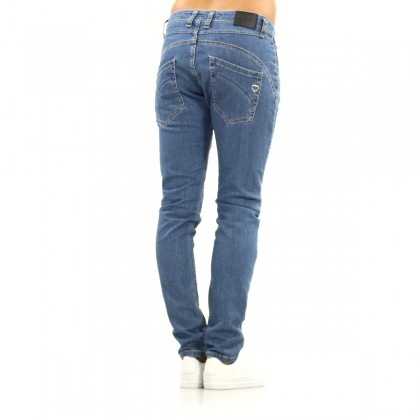 Дамски дънки Please осигуряват удобство и модерна визия в ежедневието и свободното време. Моделът е произведен от висококачествена памучна материя в класически син цвят. Акцентът е поставен върху шевовете, които се спускат по крачолите. Разполага с 5 джоба, кожен етикет с името на марката и малко метално сърчице на задния джоб. Съчетава се идеално със спортни и спортно-елегантни дрехи и обувки.