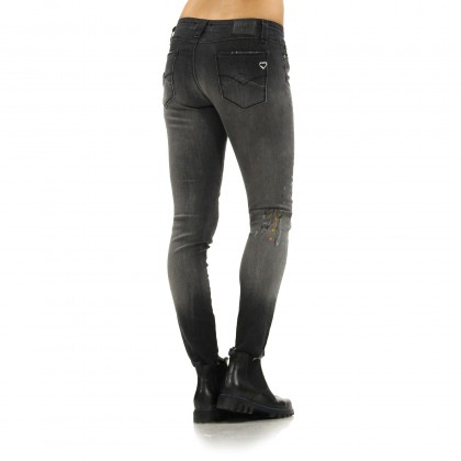 Дамски дънки Please предлагат отличен избор за ежедневието и свободното време. Моделът е със slim fit дизайн, следващ извивките на тялото. Дизайнът е с ниска талия, закопчава се с копче и цип. Добавените ефекти на избеляла тъкан, прокъсани участъци и „изцапване“ с боя, както и „отрязаните“ крачоли, придават небрежен вид на дънките. Комбинират се отлично с дрехи и обувки в спортен и спортно-елегантен стил.