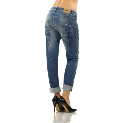 Дамски дънки PLEASE предлагат съчетание между модерен аутфит и комфорт. Дънки стил „бойфренд“ са с ниска талия, смъкнато дъно и свободна кройка. Въпреки това, подчертават тялото и са мултифункционални. Може да се носят с тениска и кецове, както и с риза и обувки на висок ток. Направени са от памучна тъкан с високо качество на изработката.