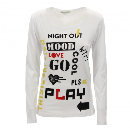 Дамска блуза с дълъг ръкав PLEASE предлага практичност и комфорт в едно решение. Блузата е произведена от 100% памук с високо качество. Разполага с голямо овално деколте и интересни надписи и изображения отпред. Комбинира се добре с дънки и панталон, както и спортни и спортно-елегантни обувки.