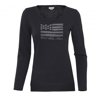 Дамска блуза U.S.Polo в черно е идеален избор за ежедневието. Висококачествената материя, заедно с класическа кройка и практичен цвят, превръщат блузата в задължителен компонент от спортно-елегантната визия. Блуза MET е с овално деколте и е решена в класически черен цвят. Върху гърдите е разположено стилизирано изображение на американското знаме и лого на марката.