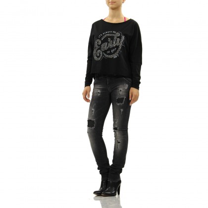 Дамска асиметрична блуза MET в черно. Ежедневният модел е изработен от висококачествена памучна тъкан в практичен черен цвят. Акцент в дизайна е удължената задна част и закачливият надпис отпред. Комбинира се отлично с панталон, дънки, спортни и спортно-елегантни обувки.