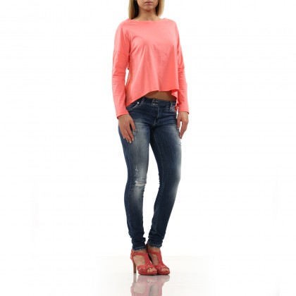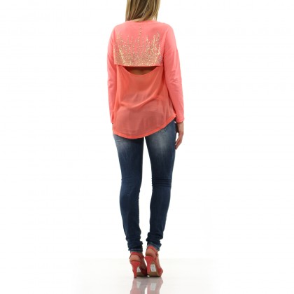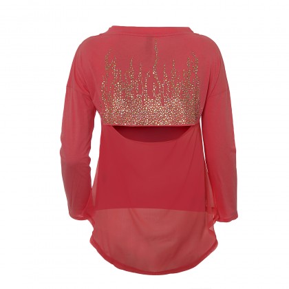Дамска блуза MET в розово. Моделът е с атрактивна визия и е подходящ акцент в тоалета. Свежият розов цвят на дрехата е комбинирана умело с ефектните блестящи елементи на гърба.  Задната част от средата на гърба до долу е представена от прозрачна и лека материя, осигуряваща асиметричност на модела.