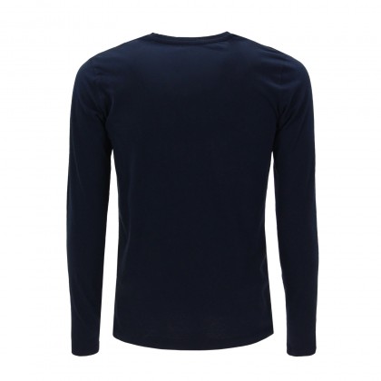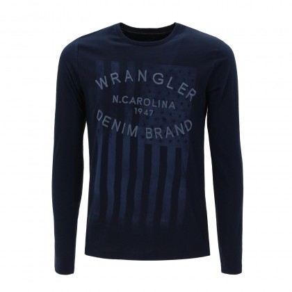 Мъжка блуза Wrangler в тъмносиньо. Изчистен модел, подходящ за ежедневието и свободното време. Комбинира се отлично със спортно-елегантни дрехи и обувки.Произведена е от 100% памук в стилен цвят и лого на марката разположено върху гърдите.