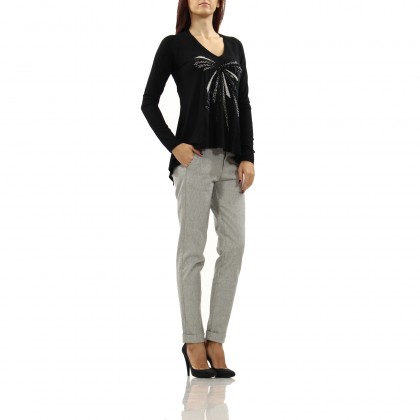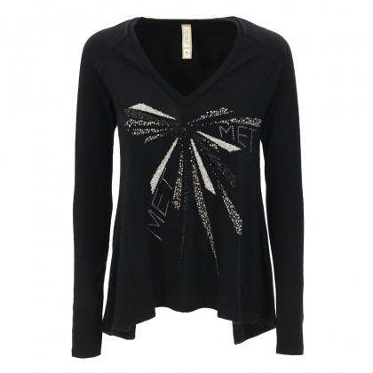 Дамска блуза с дълъг ръкав MET е едновременно стилно и атрактивно решение за ежедневието. Моделът е изработен от лека материя, а дизайнът е с V-образно деколте и разкроена долна част. Акцентът е поставен върху изображението от лъскави камъчета и гърбът тип „фрак“. Съчетава се отлично с дънки и панталон.