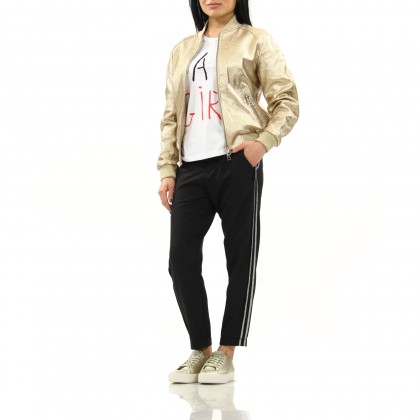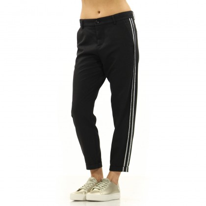 Дамски панталон IMPERIAL е страхотна комбинация между модерна визия и удобство. Моделът е със смъкнато дъно и ниска талия, както и скъсени крачоли. Така актуалната визия се допълва от двойните кантове от страни на крачолите, които са с дискретен блясък. Разполага със странични скосени джобове и е подходящ за комбиниране със спортно-елегантни дрехи и обувки.