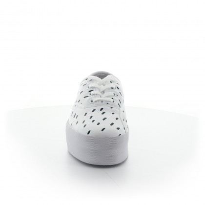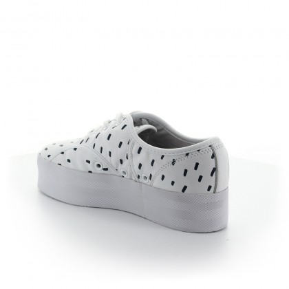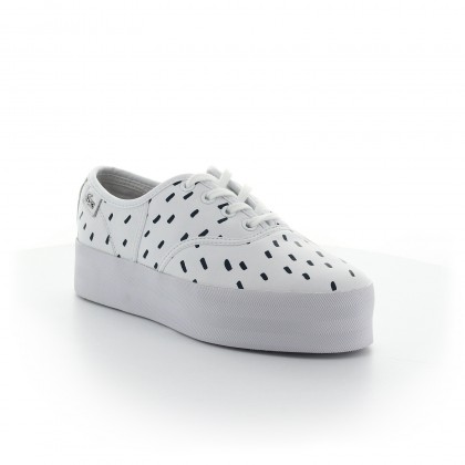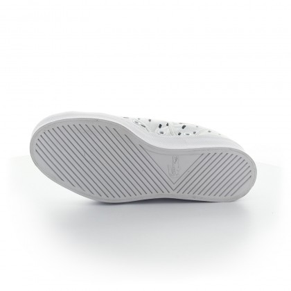 Дамски обувки Lacoste в бяло/синьо са идеални за ежедневието. Визията им е нестандартна, тъй като съчетава висока равна платформа – 3 см. Изработени са от естествена кожа в бяло със свеж син принт. Подходящ за комбиниране със спортни и спортно-елегантни дрехи.