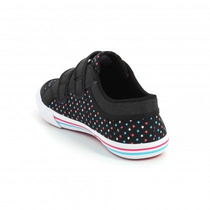 Детски маратонки Le Coq Sportif. Моделът съчетава комфорт и стил за всяко момиче. Текстилният материал, който е използван осигурява удобство и лекота. Черният основен цвят контрастира чудесно на бялата лента на подметката и многоцветните звездички на десена.