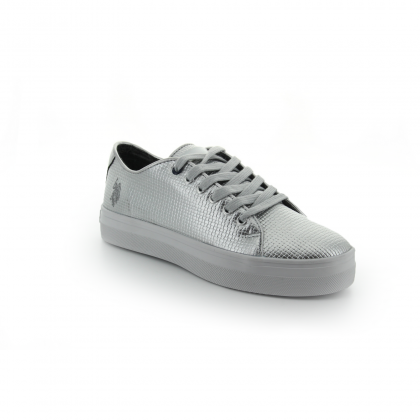 Дамски спортни обувки U.S.Polo се отличават със стилни цветове, уникална текстура и класическа визия. Моделът е произведен от висококачествен материал в сребрист цвят. Разполага със стабилна подметка в контрастиращ бял цвят, регулиращи връзки и лого на марката. Комбинира се чудесно с дрехи в спортен и спортно-елегантен стил.