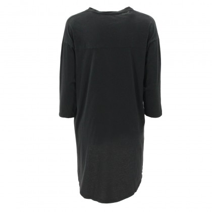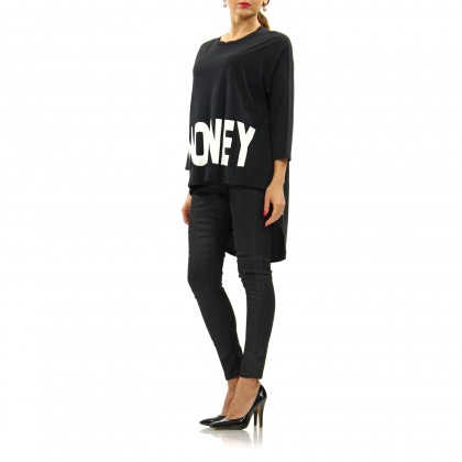 Дамска асиметрична блуза PLEASE. Моделът е изключително удобен, ефектен и практичен за ежедневието и свободното време. Може да се комбинира с клин, дънки или панталон, както и спортно-елегантни или спортни обувки. Блузата е изработена от памучна тъкан с високо качество. Класическият черен цвят е освежен с голям надпис „HONEY“ в бяло.