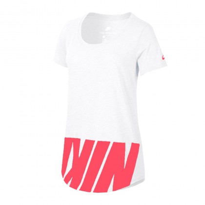Дамска блуза с къс ръкав Nike осигурява комфорт в ежедневието и свободното време. Дизайнът е свободен и с удължен силует. Разполага с овално деколте, а акцентът е поставен върху големия принт с името на марката в долната част на дрехата. Съчетава се идеално с дрехи и обувки в спортен стил.