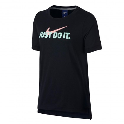 Дамска блуза с къс ръкав Nike е отлично решение за ежедневието и свободното време. Моделът съчетава класически дизайн и високо качество. Дизайнът е с овално деколте и свободна кройка, а удълженият заден панел предлага допълнително покритие. Акцентът е поставен върху надписът на гърдите „JUST DO IT“, както и логото на марката. Комбинира се отлично със спортни дрехи и обувки.