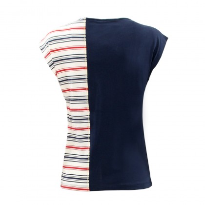 Десенът съчетава тъмносин в дясната част и бял основен с хоризонтални райета в синьо и червено, в лявата част.