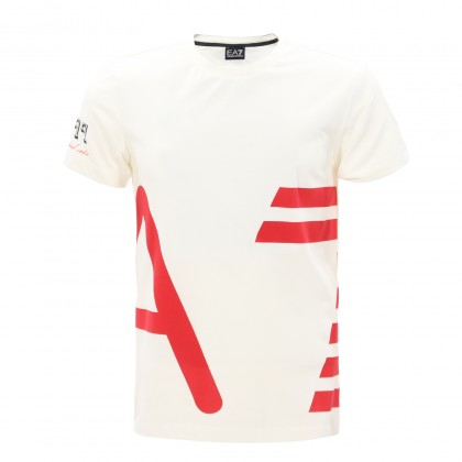 Мъжка тениска EA7 в бяло/червено. Подходящ избор за ежедневието и свободното време. Произведена е от висококачествена памучна тъкан и предлага класическа кройка и несравним комфорт. Комбинира се отлично със спортни дрехи и обувки, а практичният бял цвят повишава свободата за съчетаване с други цветове.