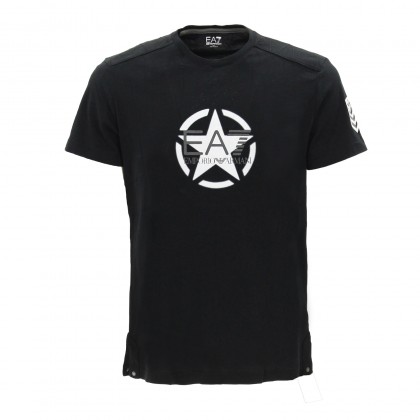 Мъжка блуза с къс ръкав EA7 предлага практичност в ежедневието и свободното време. Моделът е произведен от висококачествен памук в класическа комбинация от черно и бяло. Разполага със свободна кройка и овално деколте. Акцентът е поставен върху елементите от военна униформа – „нашивката“ на левия ръкав и звездата на гърдите. Съчетава се отлично с дрехи и обувки в спортен и спортно-елегантен стил.