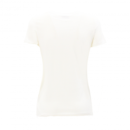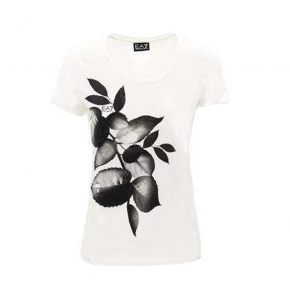 Дамска блуза с къс ръкав EA7 в бяло. Моделът предлага удобство и стил в ежедневието. Съчетава се добре със спортни и спортно-елегантни дрехи. Кройката на модела е вталена, с овално деколте и къс ръкав.