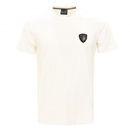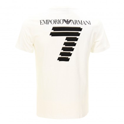Мъжка тениска EA7 в бяло. Моделът представлява класическа тениска с обло деколте и къс ръкав. Произведена е от висококачествена памучна материя, осигуряваща комфорт в ежедневието и при спортуване.