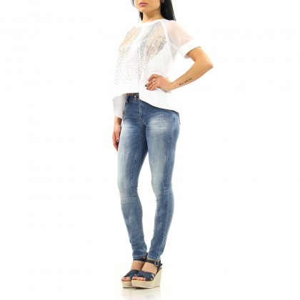 Дамска блуза с къс ръкав MET предлага атрактивна и едновременно с това стилна визия. Моделът е с овално деколте, а акцентът е поставен върху отворения гръб и полупрозрачните ръкави. Отпред е разположена декорация от блестящи камъчета, спускащи се като водопад. Комбинира се отлично със спортно-елегантни и елегантни дрехи и обувки.