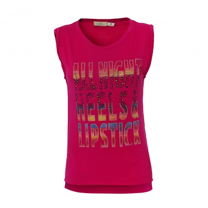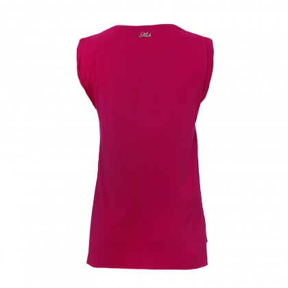Дамски топ MET в наситен розов цвят. Моделът е подходящ за всеки повод за свободното време, ежедневни задачи и други. Предлага комфорт и може да се съчетае с неофициални дрехи като къси панталонки, дънки и други. Свежият цвят е допълнен от цветни букви в закачлив надпис. Моделът е без ръкави с обло деколте. Използваната материя е лека и приятна за носене.