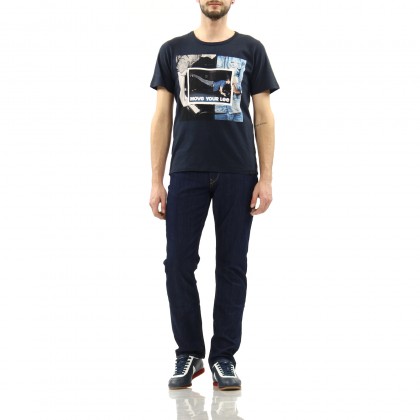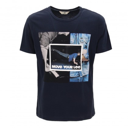 Мъжка тениска LEE е произведена от памучна материя и предлага класически дизайн, комбиниран с цветен принт на снимка и лозунг „Move Your LEE“. Дизайнът на модела е с овално деколте и къс ръкав.