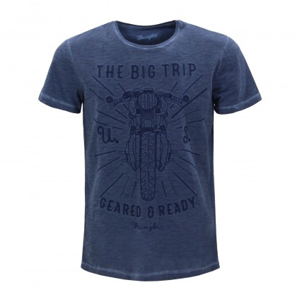 Мъжка тениска Wrangler в тъмносиньо. Изчистен модел, подходящ за ежедневието и свободното време. Комбинира се отлично със спортно-елегантни дрехи и обувки.Произведена е от 100% памук в стилен цвят, както и стилизирано изображение на мотор.
