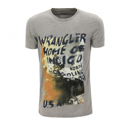 Мъжка тениска Wrangler в сиво. Практичен избор за ежедневието и свободното време. Произведена е от 100% памук в практичен светлосив цвят. Акцент във визията са надписите и природен пейзаж, разположени върху цялата предна част.Класическата кройка, с овално деколте и къси ръкави, предлага множество варианти за включване в спортна и спортно-елегантна визия.