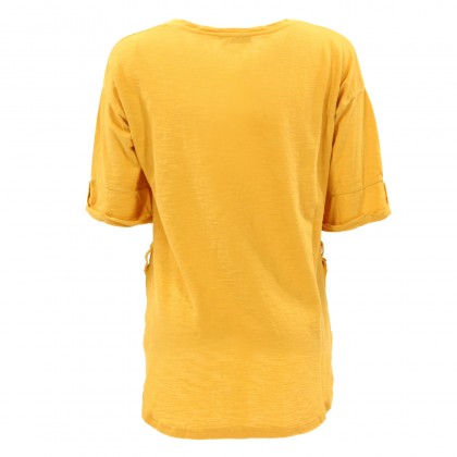 Дамска блуза с къс ръкав Please е отличен избор за ежедневието и свободното време. Моделът разполага с овално деколте и ¾ ръкав, както и с удължена задна част. Произведена е от 100% памук в наситен златен цвят. Комбинира се отлично с панталон и дънки, както и обувки в спортно-елегантен стил.