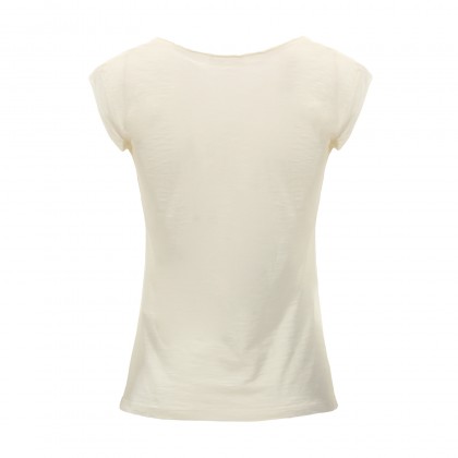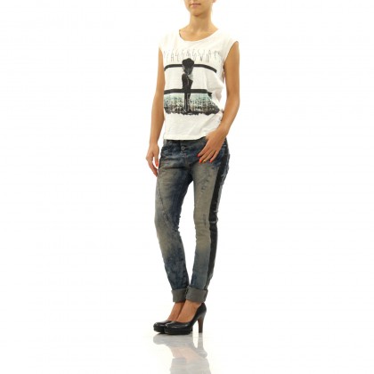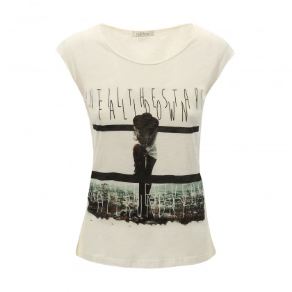 Дамска блуза с къс ръкав PLEASE комбинира висококачествена материя и практична кройка. Може да се носи в ежедневието в съчетание с дънки, панталон, къси панталони, както и спортни или спортно-елегантни обувки. Моделът е с широко деколте, а принтът е едновременно атрактивен и стилен.