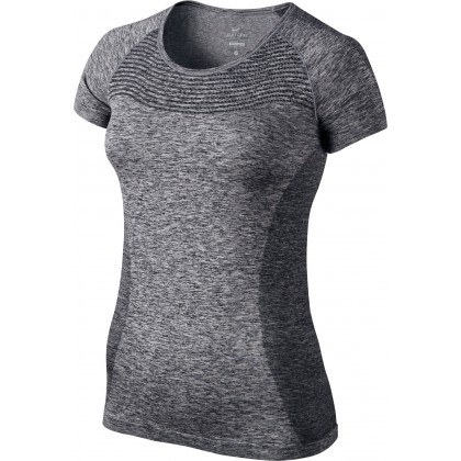 Дамска тениска Nike в черно/сиво. Моделът е подходящ избор при спортуване, а материята гарантира комфорт и подкрепа за мускулите при интензивно движение.