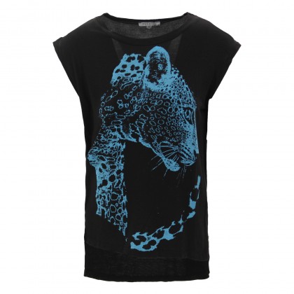 Дамска блуза с къс ръкав PLEASE е практичен и интересен избор за ежедневието. Моделът е с деколте тип „лодка“, както и много къси ръкави. Акцентът е поставен върху стилизираното изображение на леопард в неоново син цвят. Асиметричната дължина с удължен заден панел осигурява атрактивност на модела и покритие. Комбинира се отлично със спортни и спортно-елегантни дрехи и обувки.