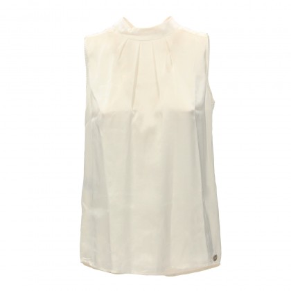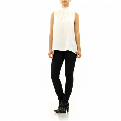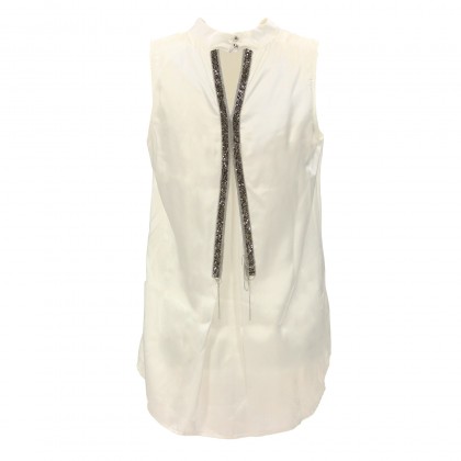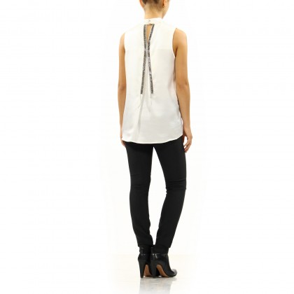 Дамски топ MET в бяло е изключително стилно решение, съчетаващо високо качество и атрактивност. Акцентът е поставен върху гърба, където са разположени две ленти по цялата дължина, изработени от блестящи кристали. Моделът е подходящ за по-специално събитие или излизане на клуб.