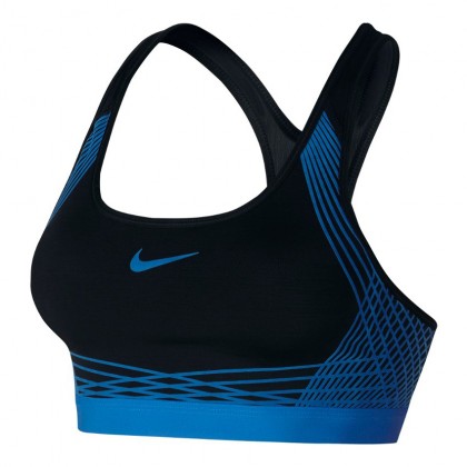 Спортен сутиен Nike в черно/синьо. Моделът е подходящ за умерено натоварване като колоездене, кардио тренировки или танци. Изработен е от Dri-FIT материя, незадържаща отделената влага от тялото. В същото време осигурява охлаждане и поддържане на кожата суха. Кройката предлага подкрепа от страна на еластичния колан и многостранна компресия върху мускулите.