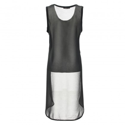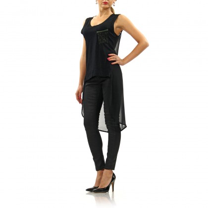 Топ PLEASE в черно. Моделът е особено атрактивен, но и стилен. Подходящ избор за специален повод. Съчетава практичен черен цвят и атрактивен прозрачен гръб, изработен от въздушна материя. Задния панел е силно удължен като поставя акцента във визията върху гърба.