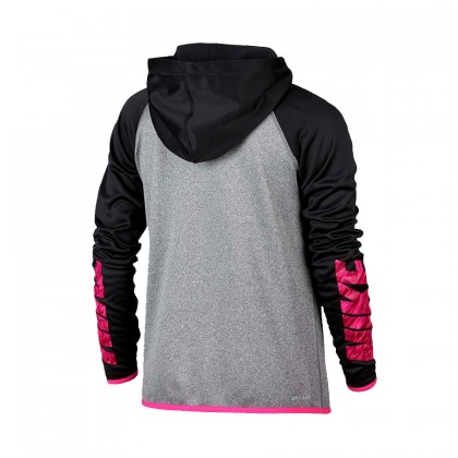 Горнище за момиче Nike в черно/сиво/розово. Подходящ избор за ежедневието, свободното време и спортуване. Моделът е изработен от висококачествена материя и съчетава практичност и спортен стил. Разполага с качулка, големи предни джобове и еластични маншети на ръкавите. Комбинира се успешно със спортни дрехи и обувки.