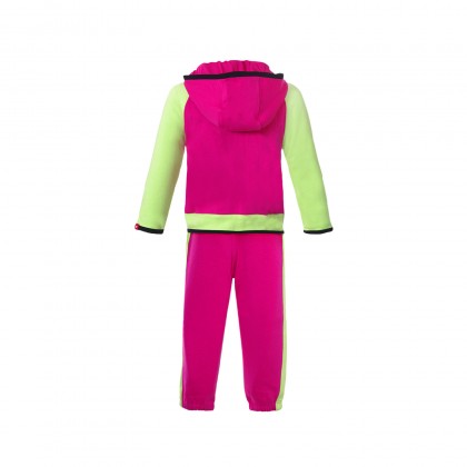 Надежден детски екип, изработен от мека, но устойчива материя със специфична плетка, която топли и предпазва детското тяло. Ергономичните шевове на екипа създават идеални условия за движение. Мъхестата вътрешна част на текстила увеличава усещането за топлина и комфорт. Горнището е снабдено с качулка с предпазна платка за устата и носа, както и джоб тип „кенгуру”. Ластиците на крачолите надеждно запазват телесната температура в дрехата и предпазват излишно мокрене по мокрите или снежни улици през есента и зимата.