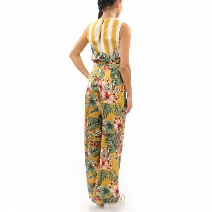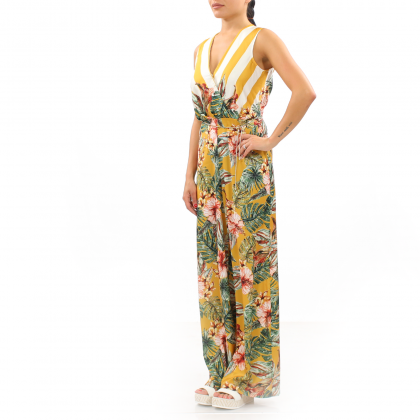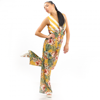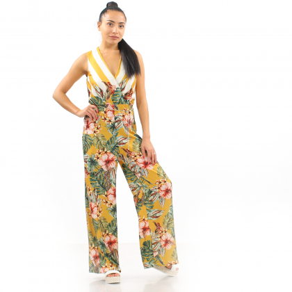 Дамски гащеризон Imperial следва модните тенденции при лятното облекло за дамите. Горната част на модела е тип „прегърни ме“, образуващо дълбоко V-образно деколте. Долната част е с крачоли тип палацо, които осигуряват свобода на движението и правят силуета по-строен. Десенът е типично летен с флорални и тропически мотиви. Комбинира се идеално с летни обувки.